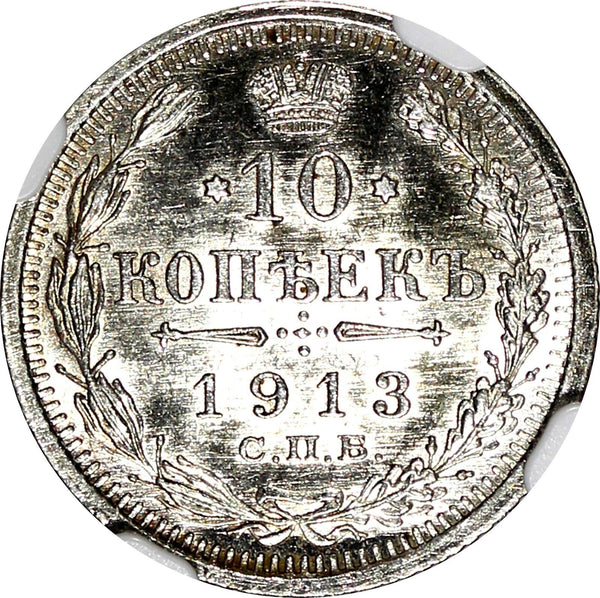 Russia Nicholas II Silver 1913 SPB 10 Kopeks NGC UNC DETAILS Y# 20a.2 (018)