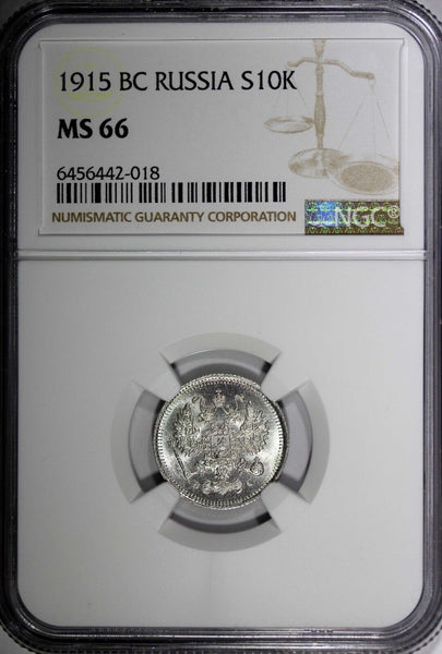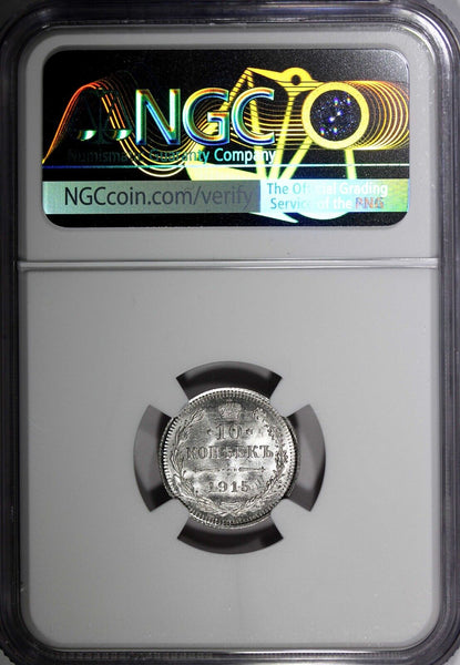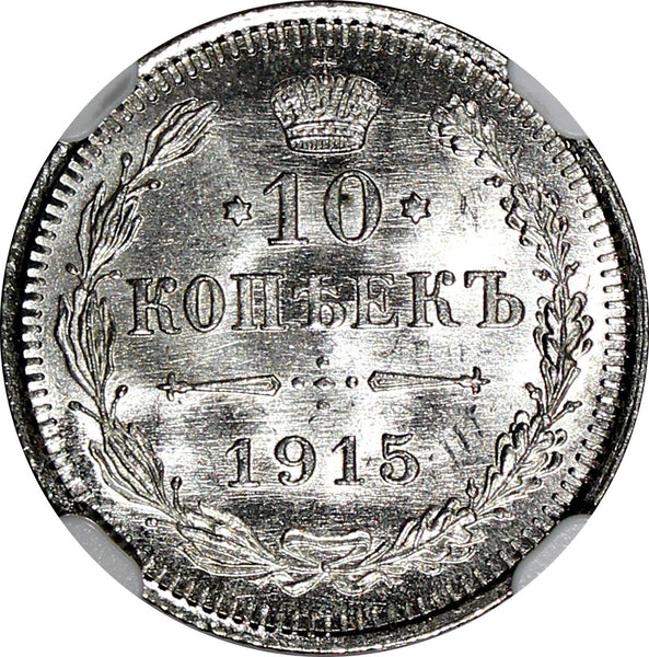 RUSSIA Nicholas II Silver 1915 10 KOPECKS NGC MS66 GEM BU Y# 20a.3 (018)