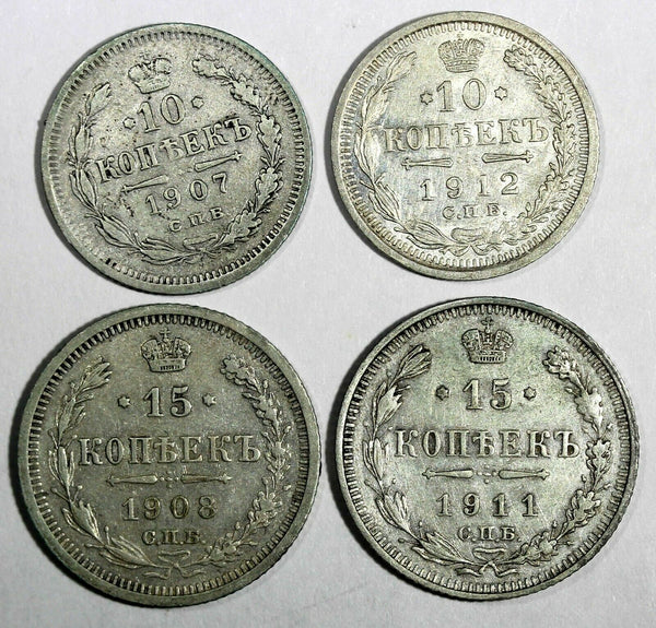 Silver LOT OF 4 COINS 1907-1912 10 Kopecks,15 Kopecks