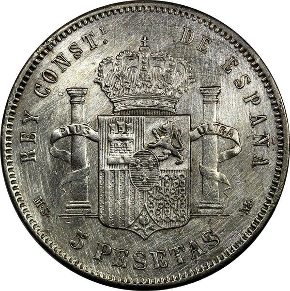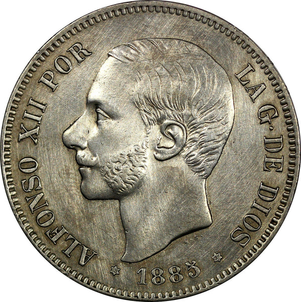 Spain Alfonso XII Silver 1885 (85) MS-M 5 Pesetas Weight: 25.0 g XF DETAILS KM# 688 Obverse: Head left Obverse Legend: ALFONSO XII POR... Reverse: Crowned arms, pillars, value below YOU WILL RECEIVED THE SAME COIN AS PICTURED. ALL COINS ARE AUTHENTIC AS DESCRIBED. 9961