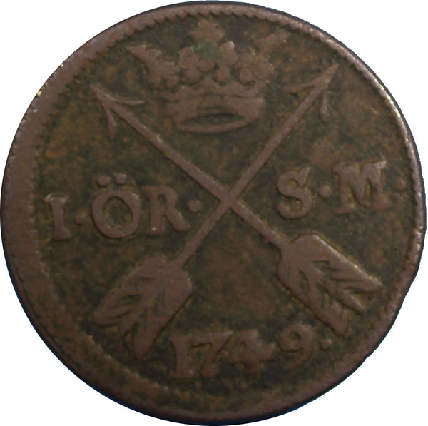 Sweden Frederick I Copper 1749 1 Ore, S.M. Obverse: Crown above monogram flanked by 3 crowns Reverse: Crossed arrows divides initials, value, crown above, date below KM# 416.1 YOU WILL RECEIVED THE SAME COIN AS PICTURED. ALL COINS ARE AUTHENTIC AS DESCRIBED. REF 6390