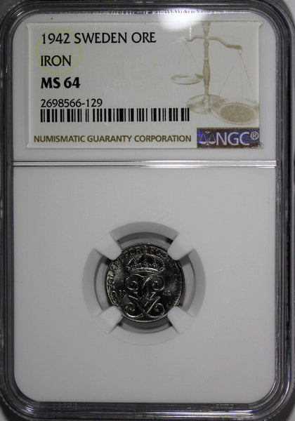 SWEDEN Gustaf V Iron 1942 1 Ore GRADED NGC MS64 World War II issues 1ST YEAR FOR TYPE KM# 810 Obverse: Crowned monogram divides date Reverse: Value and crowns YOU WILL RECEIVED THE SAME COIN AS PICTURED. ALL COINS ARE AUTHENTIC AS DESCRIBED.