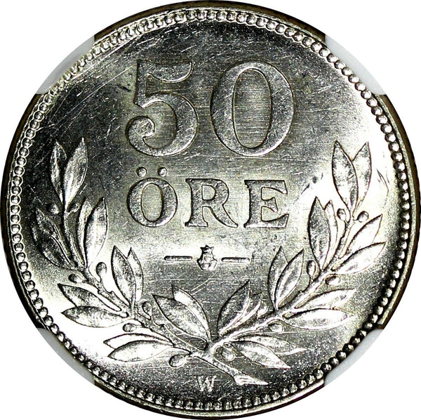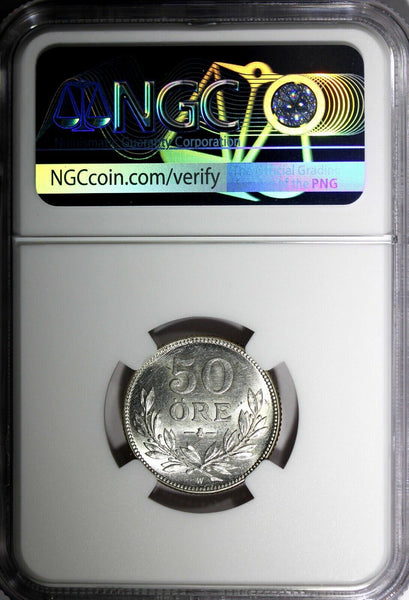 SWEDEN Gustaf V Silver 1927 W 50 Ore NGC UNC DETAILS SCARCE DATE KM# 788 (101)