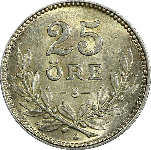 surrounded by laurel branch. Below the branch is the initial of the Riksbank