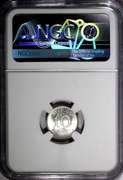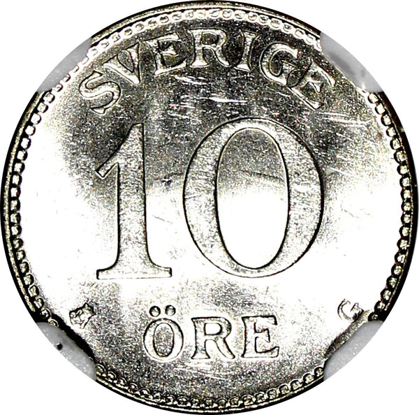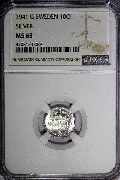 SWEDEN Gustaf V Silver 1941-G 10 Ore GRADED NGC MS63 WWII Issue KM# 780 Obverse: Three small crowns within crowned shield divides date Reverse: Value Please check out my other listings and we will be happy to combine in one package ! YOU WILL RECEIVED THE SAME COIN AS PICTURED. ALL COINS ARE AUTHENTIC AS DESCRIBED.