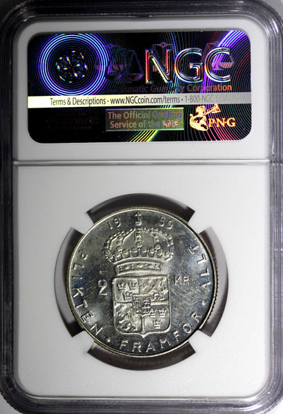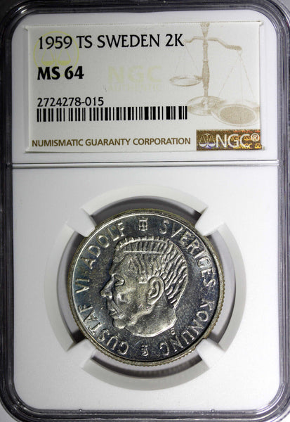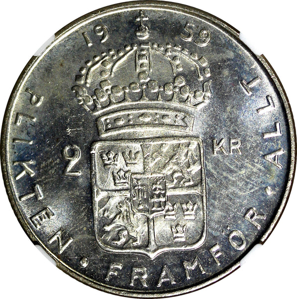 SWEDEN Gustaf VI Silver 1959 TS 2 Kronor NGC MS64 KM# 827 (015)