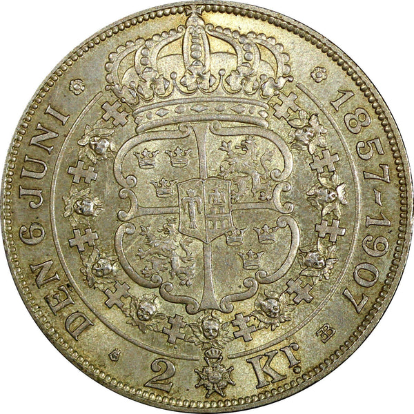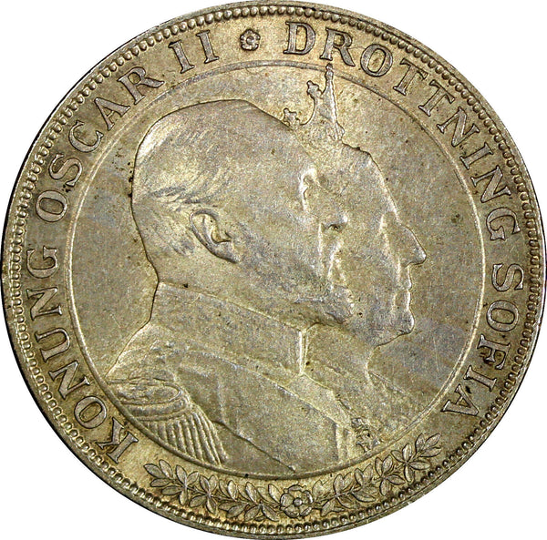 Obverse: Conjoined busts of King Oscar II and Queen Sofia facing right