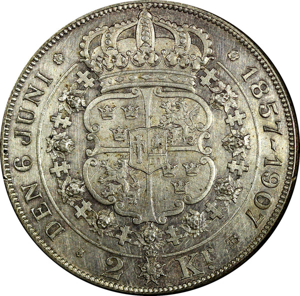 SWEDEN Oscar II Silver 1907 EB 2 Kronor Golden Wedding Anniversary KM# 776 (128)