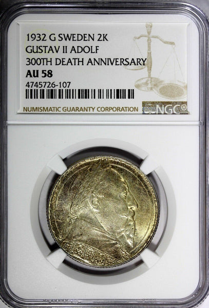 SWEDEN 300th Anniversary - Death of Gustaf II Adolf Silver 1932-G 2 Kronor GRADED NGC AU58 1 YEAR TYPE LOW MINTAGE-253,770 NICE TONING KM# 805 Obverse: Inscription within square with three small crowns within shield below Reverse: Laureate bust right Edge Description: Reeded Please check out my other listings and we will be happy to combine in one package ! YOU WILL RECEIVED THE SAME COIN AS PICTURED. ALL COINS ARE AUTHENTIC AS DESCRIBED.