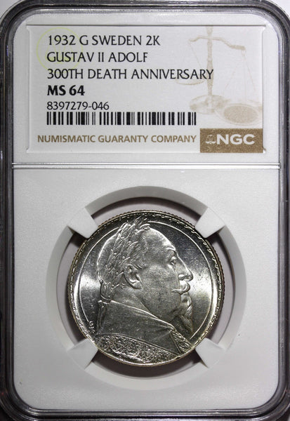 SWEDEN Silver 1932 G 2 Kronor NGC MS64 Death of Gustaf II Adolf BU KM# 805 (046)
