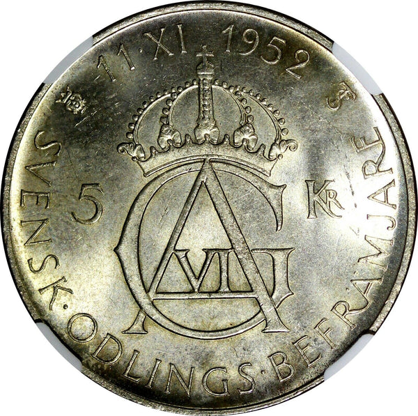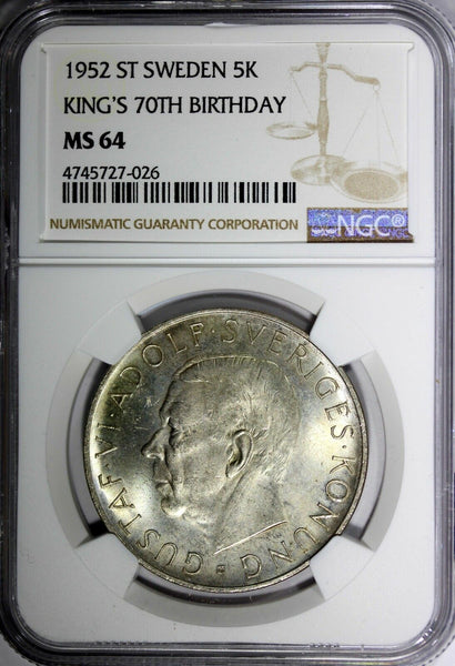 SWEDEN Silver 1952 ST 5 Kronor GRADED NGC MS64 NICE TONING 70th Birthday Gustaf VI Adolf 1 YEAR TYPE.LOW MINTAGE-242,241 Weight: 22.8800g Diameter: 36mm KM# 828 Obverse: Head left Reverse: Crowned monogram divides value Edge Description: Plain Please check out my other listings and we will be happy to combine in one package ! YOU WILL RECEIVED THE SAME COIN AS PICTURED. ALL COINS ARE AUTHENTIC AS DESCRIBED.