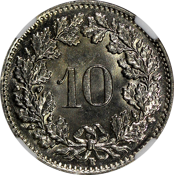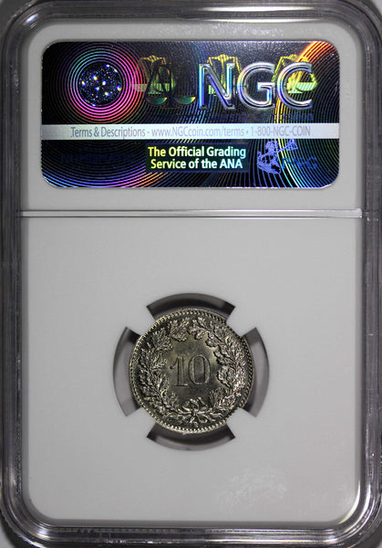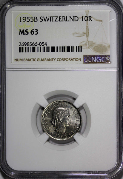 Switzerland Copper-Nickel 1955-B 10 Rappen GRADED NGC MS63 BU COIN KM# 27 Obverse: Crowned head right Obverse Legend: CONFOEDERATIO HELVETICA Obverse Designer: Karl Schwenzer Reverse: Value within wreath Reverse Designer: Karl Friedrich Voigt Edge Description: Plain YOU WILL RECEIVED THE SAME COIN AS PICTURED. ALL COINS ARE AUTHENTIC AS DESCRIBED.