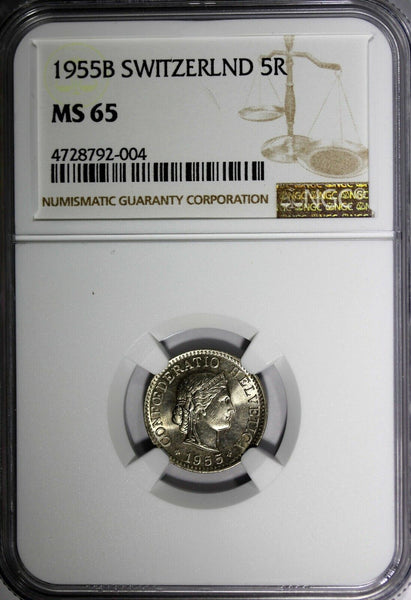 SWITZERLAND Copper-Nickel 1955 B 5 Rappen GRADED NGC MS65 KM# 26 Obverse: Crowned head right Obverse Legend: CONFOEDERATIO HELVETICA Obverse Designer: Karl Schwenzer Reverse: Value within wreath Reverse Designer: Karl Friedrich Voigt Edge Description: Plain Please check out my other listings and we will be happy to combine in one package ! YOU WILL RECEIVED THE SAME COIN AS PICTURED. ALL COINS ARE AUTHENTIC AS DESCRIBED.