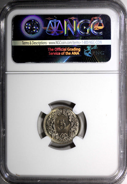 SWITZERLAND Copper-Nickel 1955 B 5 Rappen GRADED NGC MS65 KM# 26 Obverse: Crowned head right Obverse Legend: CONFOEDERATIO HELVETICA Obverse Designer: Karl Schwenzer Reverse: Value within wreath Reverse Designer: Karl Friedrich Voigt Edge Description: Plain YOU WILL RECEIVED THE SAME COIN AS PICTURED. ALL COINS ARE AUTHENTIC AS DESCRIBED.