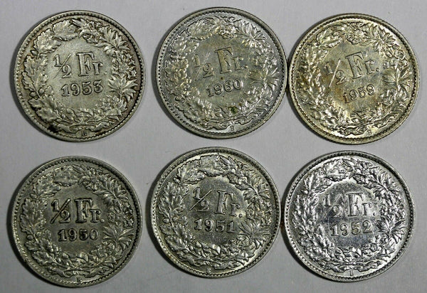 Silver LOT OF 6 COINS 1950-1960 1/2 Franc