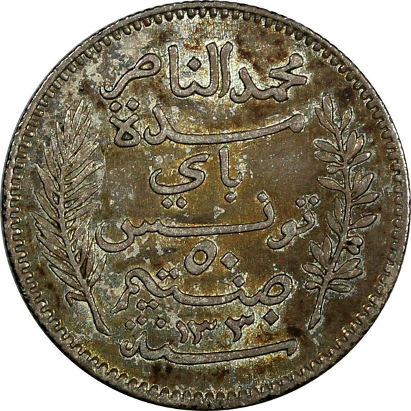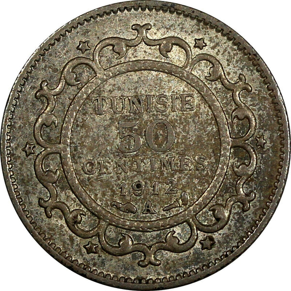 TUNISIA Muhammad V Silver AH1330 1912 50 Centimes aUNC Nice Toned KM# 237 (973)