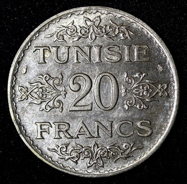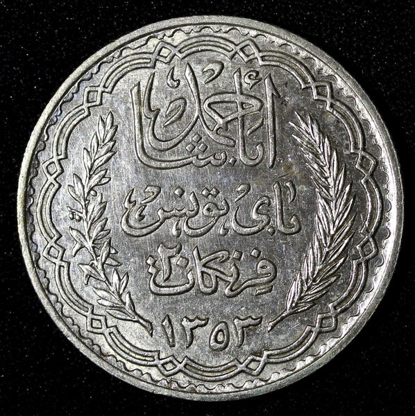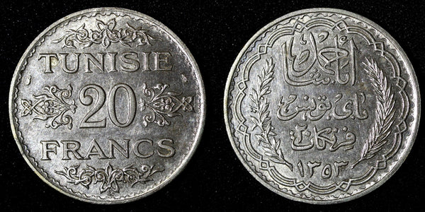 TUNISIA Silver AH1353 1934 20 Francs 35mm aUNC/UNC KM# 263 (28 439)