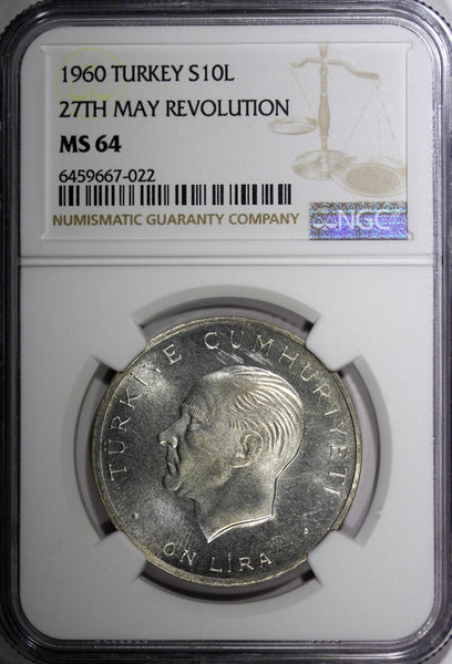 Turkey Silver 1960 10 Lira 27th May Revolution NGC MS64 KM# 894 (022)