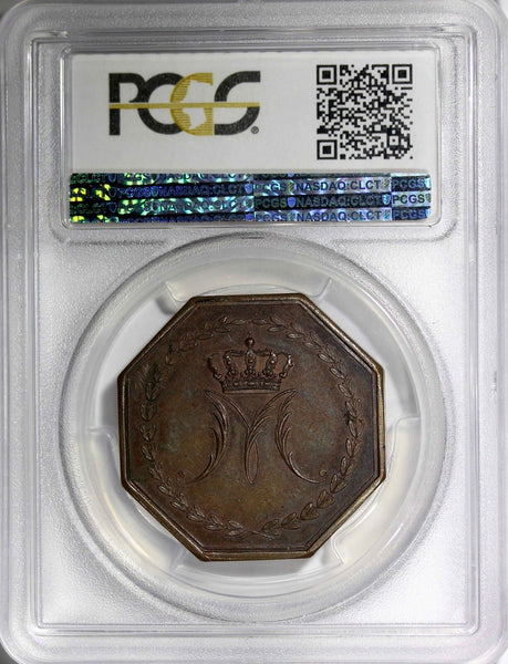 GERMANY BAVARIA ND BRONZE MEDAL VARIETY PIEFORT King Maximilian I Joseph of Bavaria Royal Monogram of King Maximilian I Joseph GRADED PCGS MS63 TOP GRADED BY PCGS WITT-2545 Birth: May 27, 1756 Death: Oct. 13, 1825 German Royalty. First king of Bavaria, as Maximilian IV. Joseph Elector of Bavaria. He was born in Mannheim as the youngest son of Count Palatine Friedrich Michael von Zweibrücken-Birkenfeld. He became a member of the french army and soon rose to the rank of major-general. In 1789 he joined the Austrian army and fought against the french revolutionary army. He succeeded his brother Karl II. as duke of Zweibrücken in 1795. In September 1785 he married Auguste Wilhelmine Marie of Hesse-Darmstadt. In the eleven years of their marriage she gave birth to five children, and died in 1796. One year later he married the twenty years younger Caroline Friederike of Baden. The elector Karl IV. Theodore of Bavaria died childless in 1799 and he succeeded him as he was the next relative. He sympathized with France and allied with Napoleon. He even married his oldest daughter, from his first marriage, to Eugène de Beauharnais, Napoleons stepson. He was one of the emperors most faithful allies and as a reward the duchy of Bavaria was raised to a kingdom. Maximilian assumed the title of a king on January 1st 1806. In the same year Bavaria joined the Confederation of the Rhine. In October 1813, ten days before the Battle of Leipzig he joined the allied armies but not without the concession that his kingdom would further exist after Napoleon's fall. After the Congress of Vienna he lost some of his territory. In 1818 he signed a liberal constitution. He was very popular, his subjects affectionately called him "King Max". (bio by: Lutetia) YOU WILL RECEIVED THE SAME COIN AS PICTURED. ALL COINS ARE AUTHENTIC AS DESCRIBED.