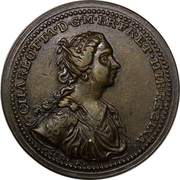 1761, Great Britain. George III OFFICIAL CORONATION MEDAL OF CHARLOTTE. Queen Charlotte was married to King George III in 1760. By Lorenz Natter. Bronze 34mm. Obv: Bust of Charlotte facing right. Legend: CHARLOTTA . D.G. M . BR . FR. ET . HIB . REGINA. (Charlotte, by the grace of God, queen of Great Britain, France and Ireland). Rev: The Queen standing, facing being crowned by Fame hovering above. Legend: QVAESITVM . MERITIS (Sought for his deserts [Horace]). Exergue: CORON . XXII . SEPT . / MDCCLI (Crowned September 12, 1761). BHM 66, Eimer 696 10584 YOU WILL RECEIVED THE SAME COIN AS PICTURED. ALL COINS ARE AUTHENTIC AS DESCRIBED.