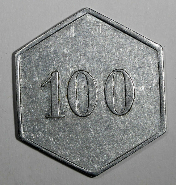 Interesting aluminum token, "100" (pfennig). Hexagonal shape.