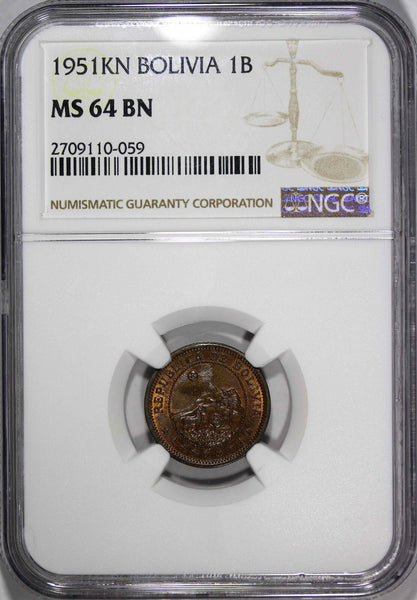 BOLIVIA Bronze 1951-KN 1 Boliviano GRADED NGC MS64 BN 1 YEAR TYPE KM# 184 Obverse: State emblem within circle, stars below Reverse: Denomination within wreath, date below Edge Description: Reeded YOU WILL RECEIVED THE SAME COIN AS PICTURED. ALL COINS ARE AUTHENTIC AS DESCRIBED.